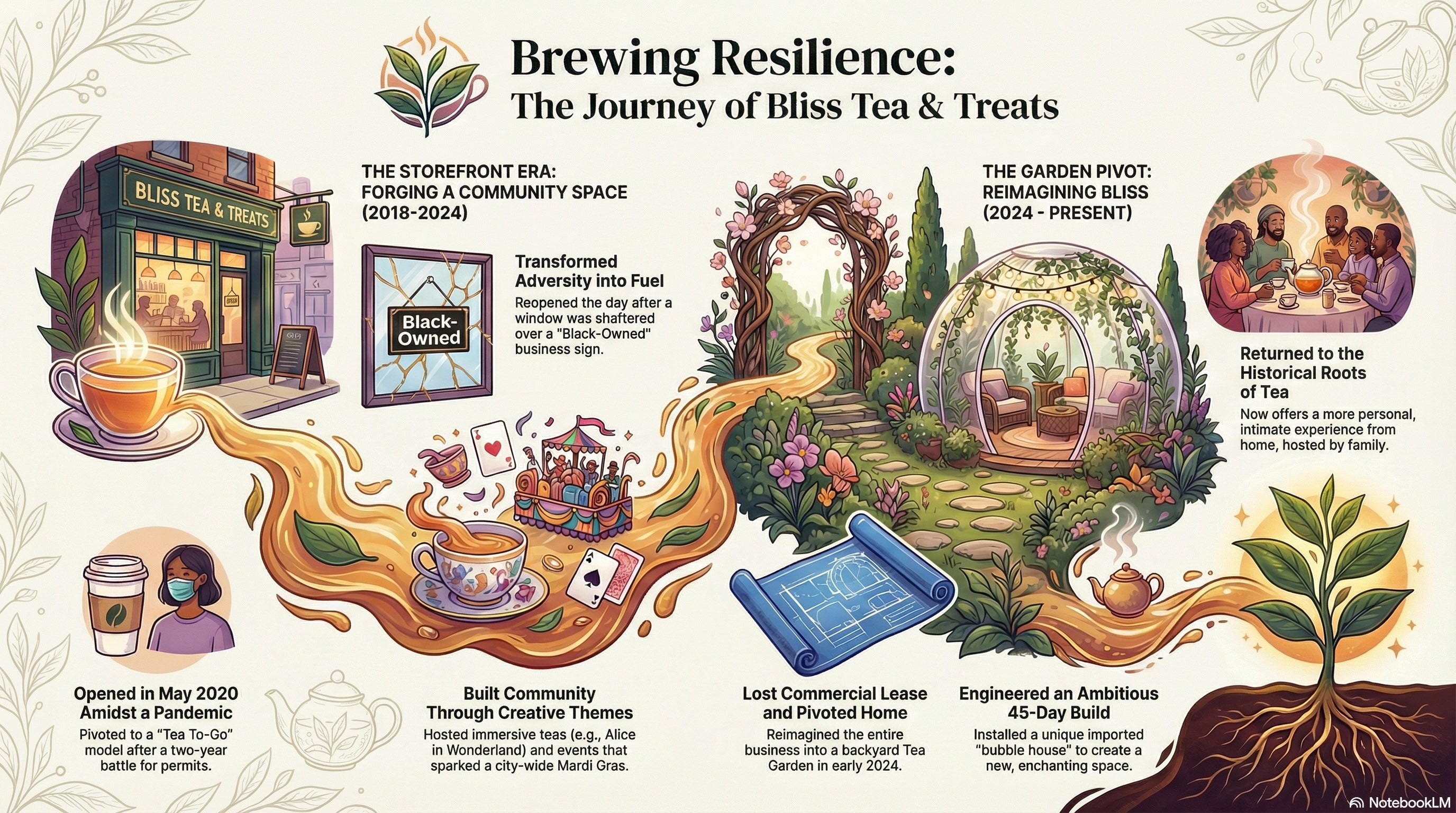 Bliss Tea & Treats began in a commercial space before evolving into a more intimate home garden setting. This transition allowed us to create a warmer, more personal environment where guests can slow down and truly experience the ritual of tea. Today, the garden at Bliss offers a peaceful space for curated tea gatherings, connection, and meaningful moments..